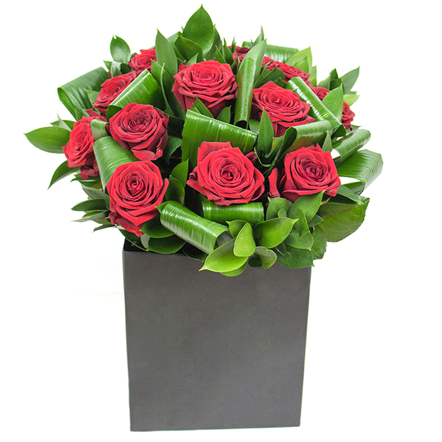 Embrace timeless elegance with our classic red rose bouquet, featuring beautiful red roses, lush aspidistra leaves, and sophisticated ruscus. This arrangement offers a refined and unique touch to any space.